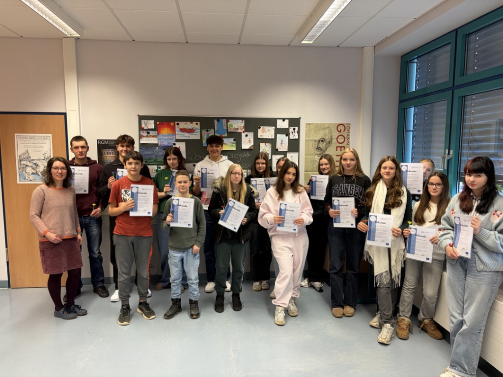 Als Dankeschön und zur Anerkennung ihrer engagierten Arbeit erhielten die Latein-Schülerinnen und Schüler im Rahmen einer Feierstunde von ihrer Latein-Lehrerin Diana Hedwig und dem stellvertretenden Schulleiter Andreas Schindele Urkunden der Universität Göttingen sowie kleine Papierblumen überreicht.